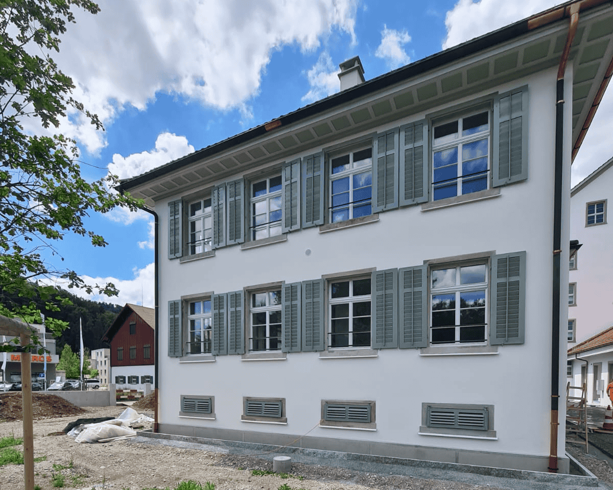 Die Villa Bühler, einst das Herrenhaus der Alten Spinnereifabrik, erstrahlt nach einer umfassenden Sanierung in neuem Glanz. Das zuvor unbewohnbare Gebäude wurde mit grossem handwerklichem Können und viel Liebe zum Detail innen wie aussen vollständig neu aufgebaut. In enger Zusammenarbeit mit namhaften Partnern durften wir unter der Leitung von Ueli Lüthi sämtliche Gipserarbeiten ausführen. Besonders hervorzuheben ist die präzise Ausführung der Fassade bis auf die Grundmauern sowie der markante Sichtbetonsockel mit Filetfeldern. Im Inneren verbindet das Projekt historische Substanz mit moderner Architektur: In Abstimmung mit der Denkmalpflege und geprägt durch die Ideen von René Zettel entstanden zwei exklusive 3.5-Zimmer-Wohnungen mit grosszügigen 160m2 Wohnfläche. Ein besonderes Highlight bilden die aufwendig restaurierten Kachelöfen, die den Wohnräumen eine einzigartige, stilvolle Atmosphäre verleihen. Ergänzt wird das Angebot durch ein gemeinsames Atelier im Untergeschoss. Ein Projekt, das Tradition, Qualität und zeitgemässes Wohnen auf höchstem Niveau vereint.